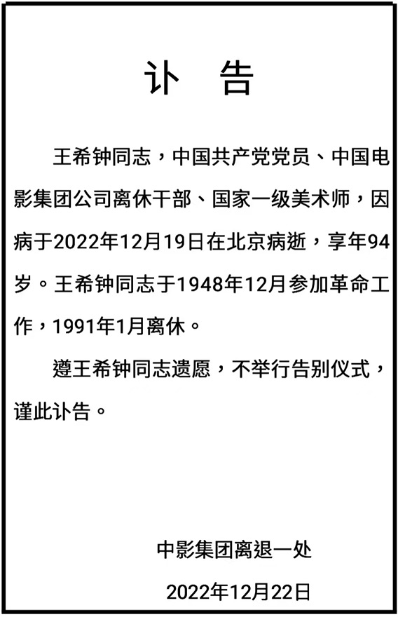 王希鐘,1928年出生于山東,1954年赴蘇聯進修電影化妝,是我國著名影視化裝師、國家一級電影美術設計師、原中國電影電視技術學會化裝委員會主任,新中國化裝事業發展的推動者之一。